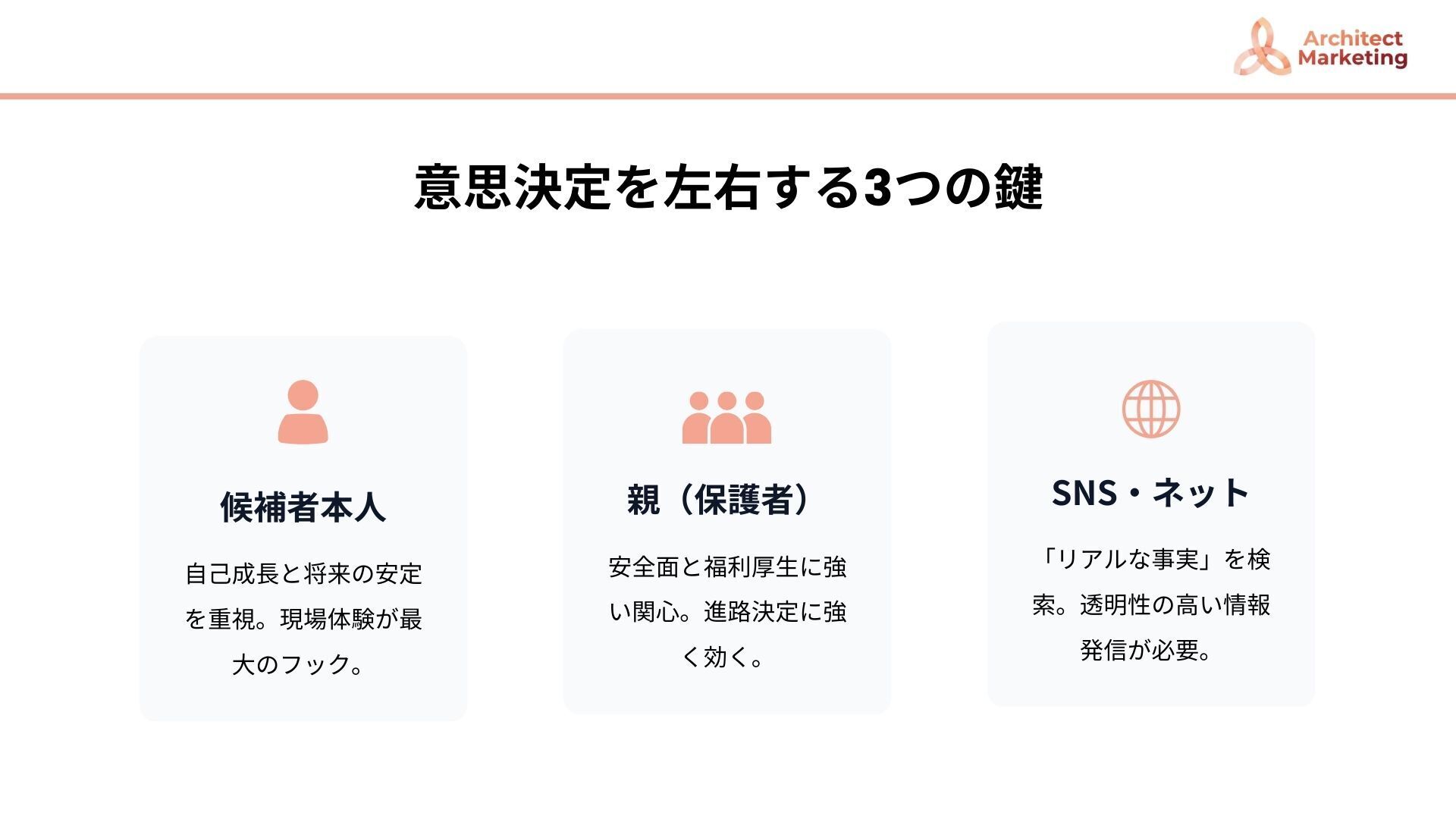 若手採用は“本人の気持ち”だけで完結しません。家族・先生・体験・SNSまで含めて設計する会社が強い、という示唆です。